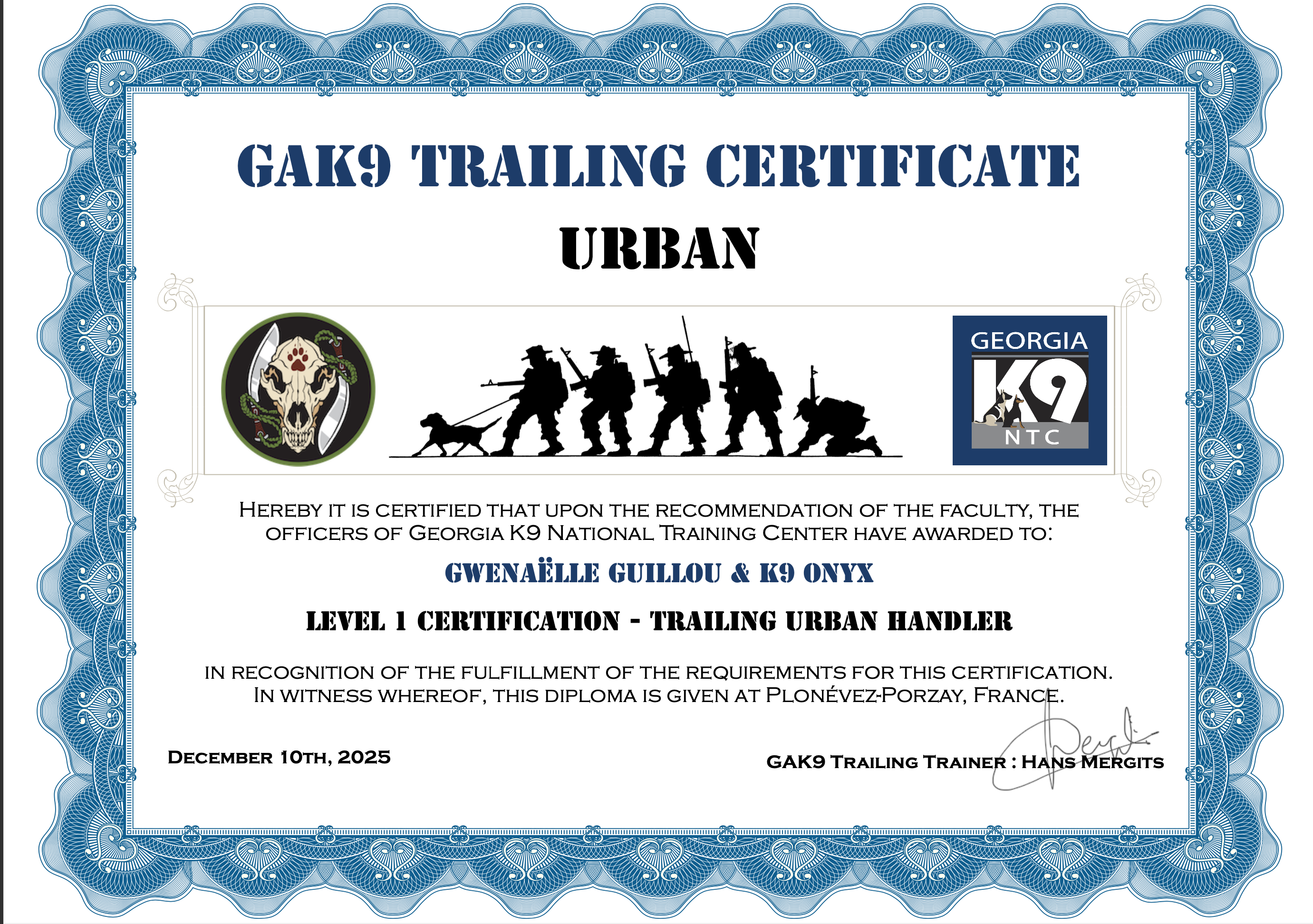 Avec ONYX, nous avons passé les derniers level 1 des certifications GAK9 soit le rural et l'urbain, qui viennent compléter le field et le sub-urbain que nous avions déjà. Merci aux différents runners et instructeurs pour avoir rendu cela possible. Bravo ma chouquette