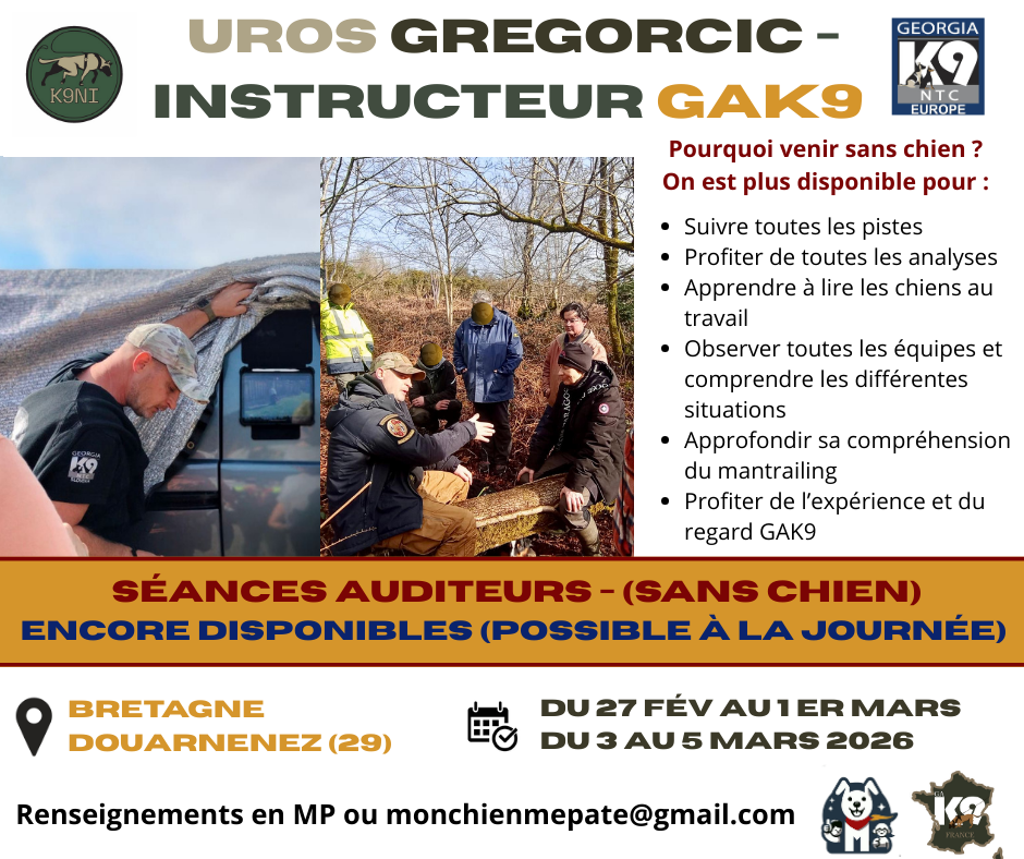 Les journées avec chien sont complètes, mais si vous souhaitez profiter de la venue en Bretagne de UROS GREGORCIC, instructeur GAK9, n'hésitez pas à réserver une ou plusieurs journées en auditeur.